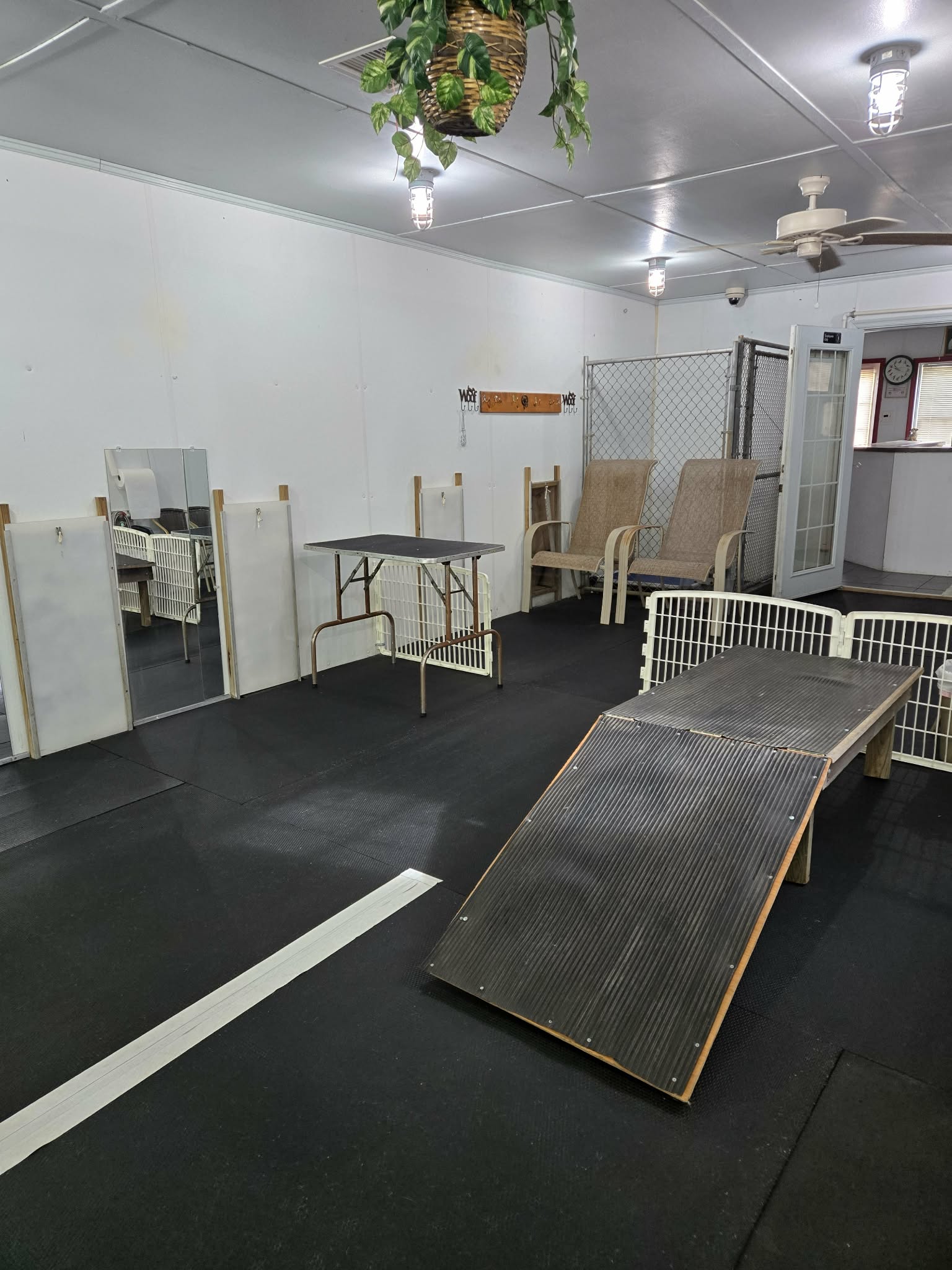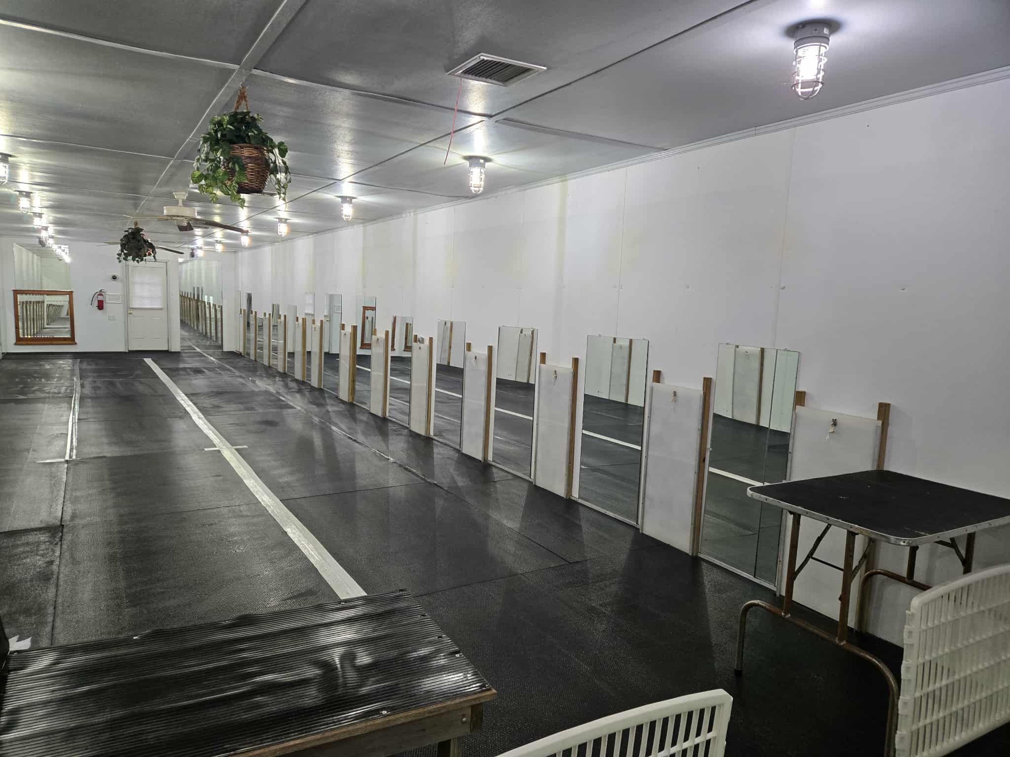 Matted floors, table, ramp, mirrors, heated & air conditioned building.